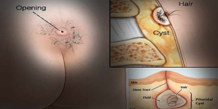 This problem forms in the natal cleft (the area between you buttocks). Bacteria carried by hair in the natal cleft (either from hair that has grown there, or that is loose and has collected there) can form an abscess, or a situation where the pus will drain through a sinus to the skin surface (see above pic)..
